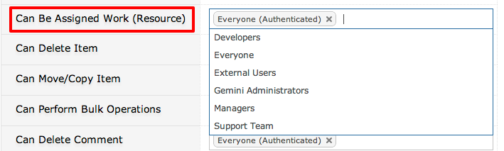 Permissions control who can work on items (resources). Gemini administrators can edit permissions and select who can be assigned work.